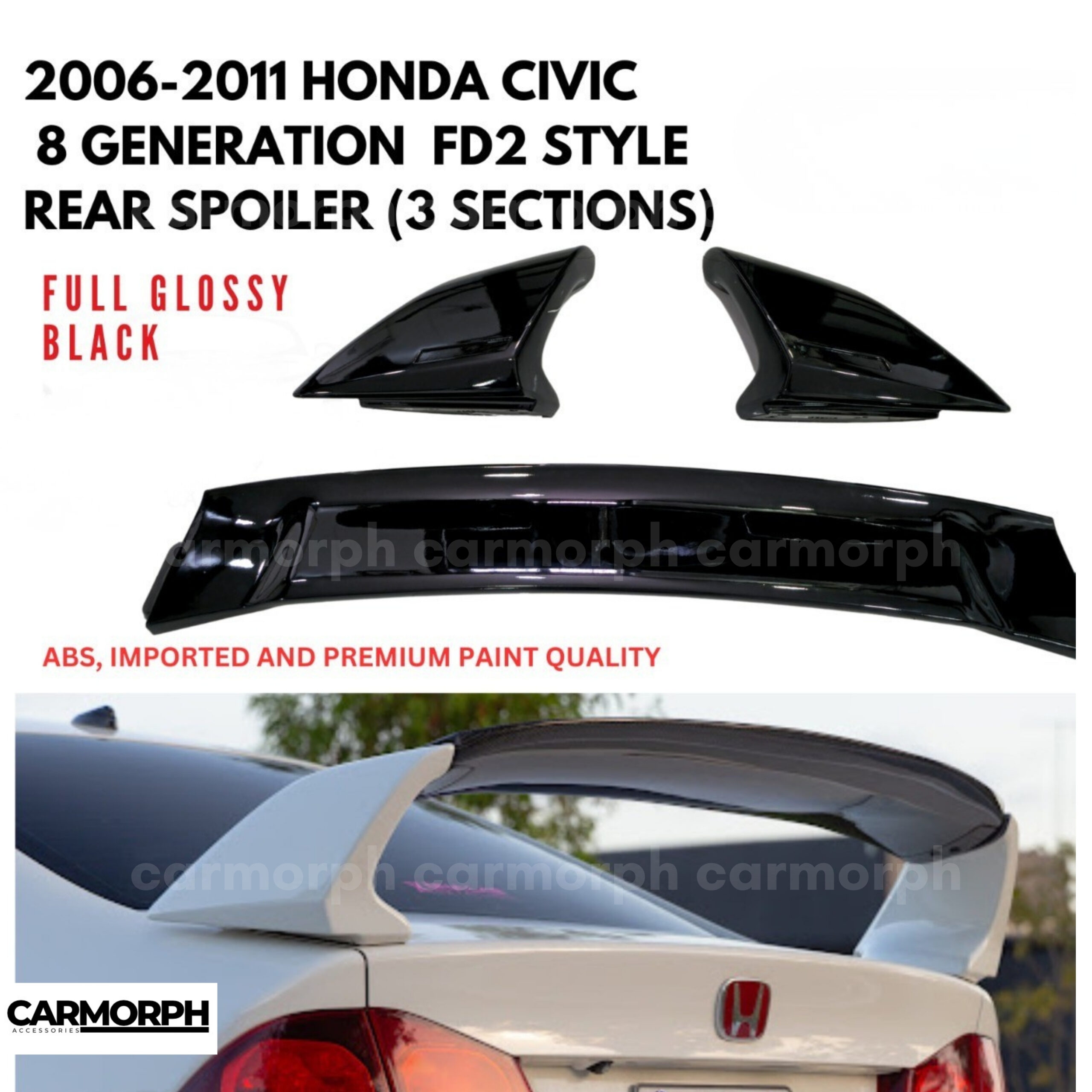 High-value keywords: Honda Civic FD2 style rear spoiler, 2006-2011, 8th generation, 3-section, full glossy black, ABS plastic, direct fit, sporty trunk spoiler.​