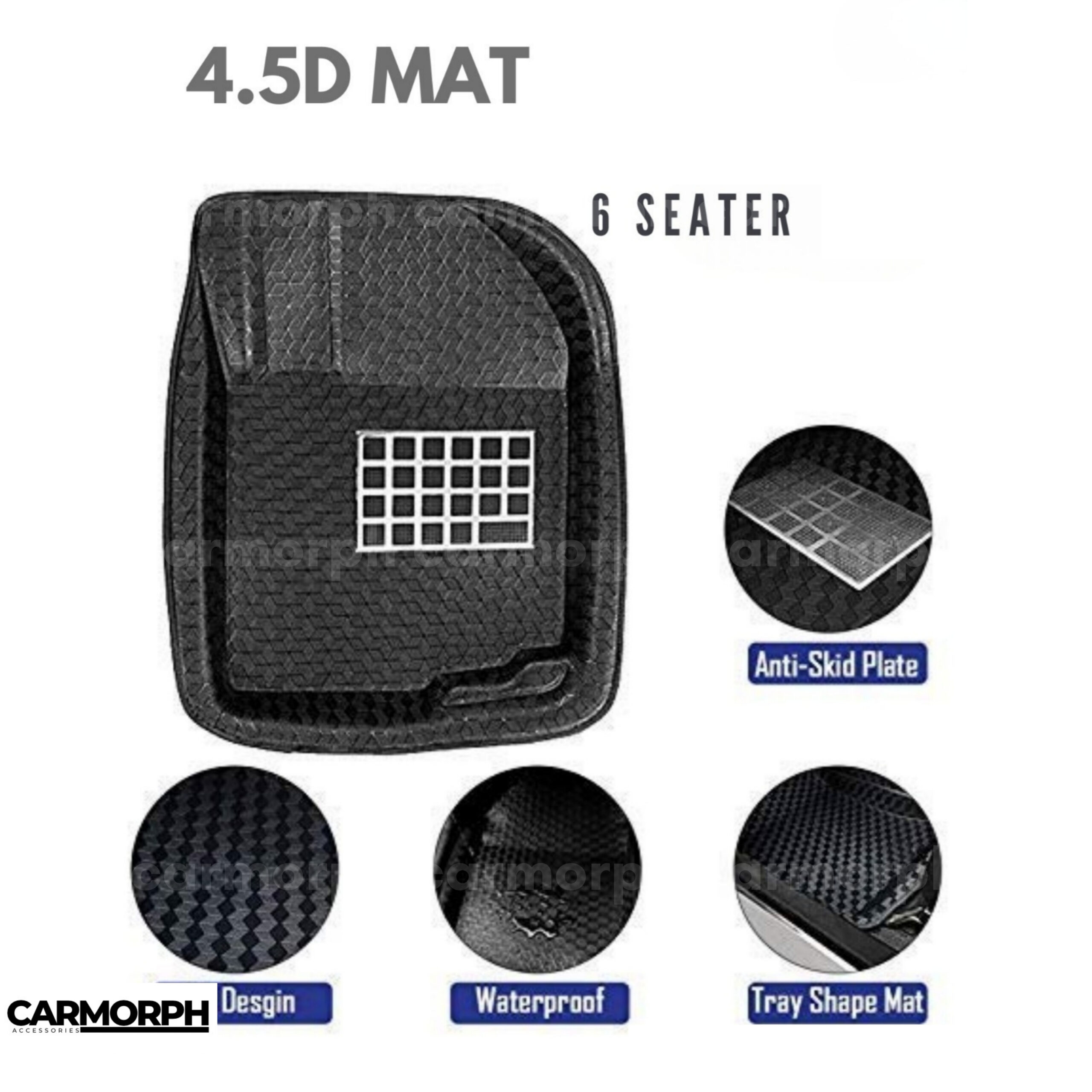 4.5D Mat 6 Seater is a premium car floor mat set crafted from durable EVA or PVC material, tailored for 6-seater vehicles. It features a three-dimensional custom fit, waterproof, dustproof protection, and is easy to clean. The design provides full coverage and enhances the interior look with its tray-shaped contour.