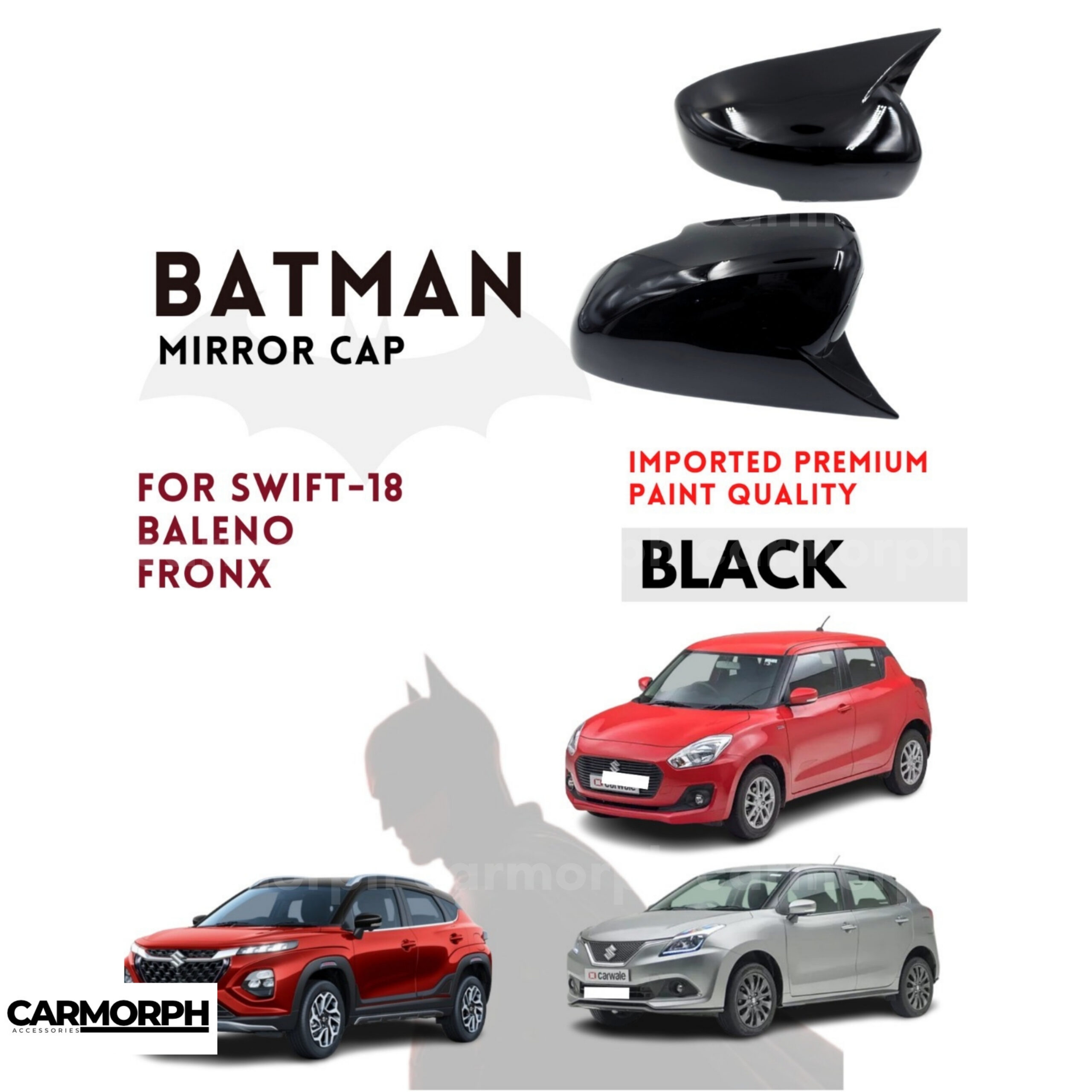 High-value keywords: Batman mirror cap Swift 2018, Baleno Batman mirror cover, Fronx side mirror cap, Maruti Suzuki Batman mirror caps, ABS plastic mirror covers, glossy black mirror caps, custom fit car mirror covers