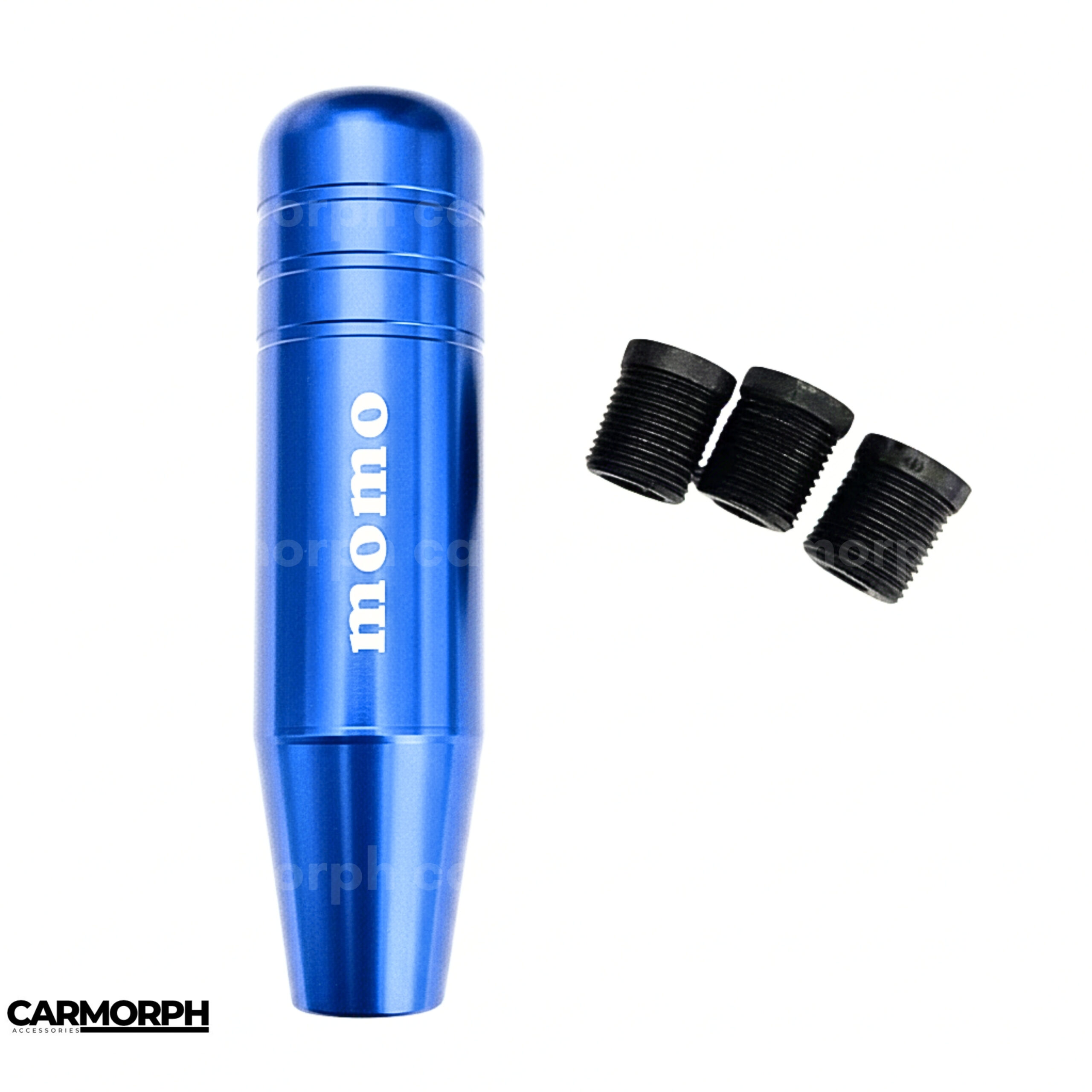 The Blue Momo Gear Knob (13 cm) is a universal-fit aluminum shift knob finished in a striking blue or blue carbon fiber style, measuring 13 cm in length. It’s designed for most manual transmission vehicles, comes with multiple adapters for installation, and adds a sporty, colorful look to your car’s interior.
