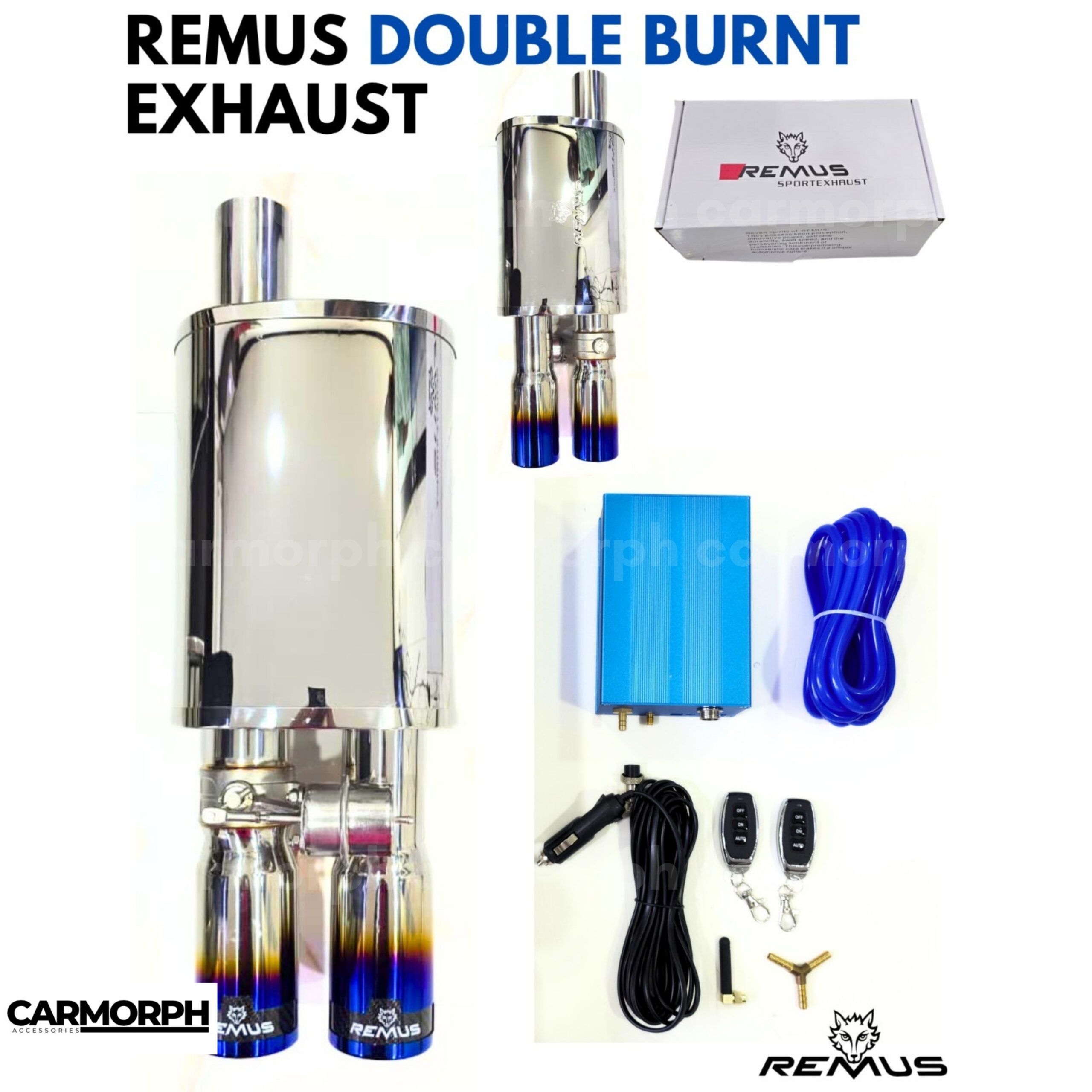 Remus Double Burnt Exhaust is a universal high-performance exhaust system featuring dual burnt carbon titanium tips with a sleek, aggressive look. Made from premium stainless steel with a weather-resistant finish, it incorporates advanced Valvetronic wireless valve technology that allows adjustable exhaust sound control via remote. This system improves exhaust flow, enhances engine performance, and offers customizable sound levels—from quiet cruising to bold roaring. It fits most petrol cars, with professional installation recommended for best results. The package includes the dual-tip muffler unit and the Valvetronic control module for easy noise adjustment.​
