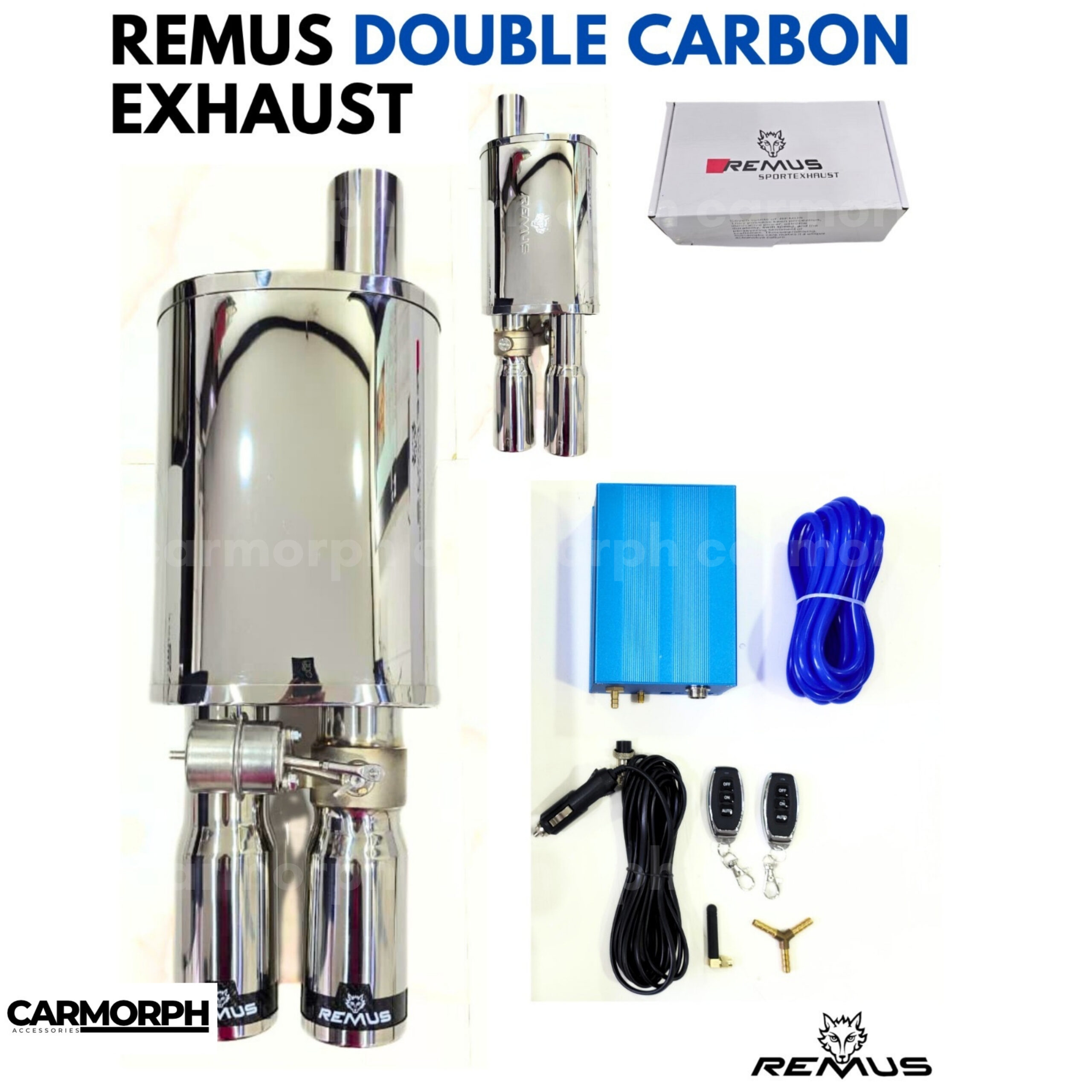 Remus Double Exhaust is a universal performance exhaust system featuring dual outlet tips, typically made from high-grade stainless steel and often finished with carbon fiber or titanium accents. Designed for petrol vehicles, it uses Valvetronic valve technology for customizable sound control (via wireless remote) and delivers enhanced exhaust flow, aggressive looks, and improved engine output. The exhaust is weather-resistant, durable, and fits most cars with straight pipe connections; professional installation recommended for optimum performance.
