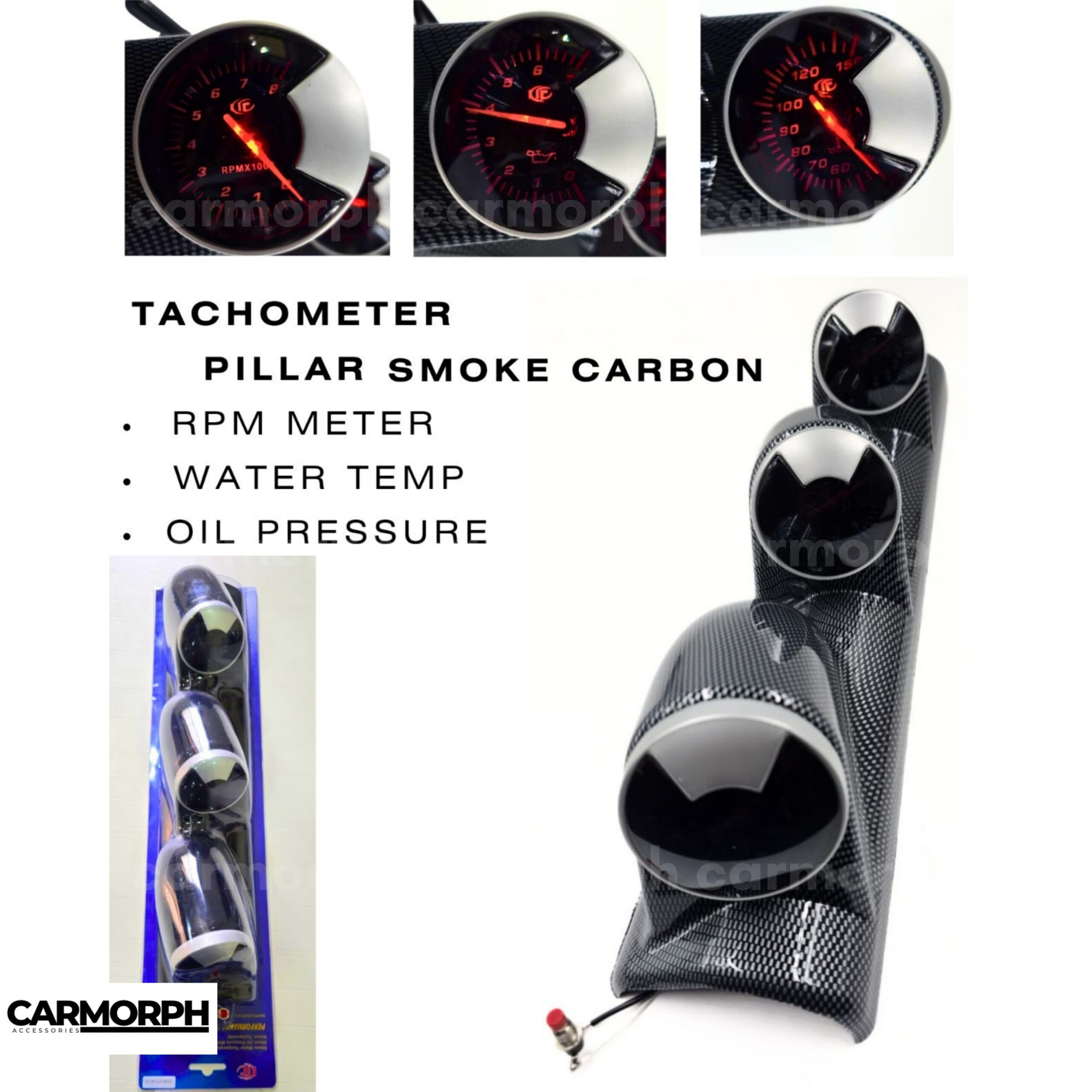 Tachometer Pillar Smoke Carbon is a stylish gauge pod designed to hold a 52mm tachometer with a smoked carbon fiber finish for a premium sporty look. It typically mounts on the vehicle’s A-pillar or dashboard, providing easy visibility of engine RPM. Made from durable ABS plastic with a carbon fiber pattern and smoked tint, it offers both aesthetics and durability. This pillar often includes multiple gauge slots and provides secure mounting for performance or racing applications.
