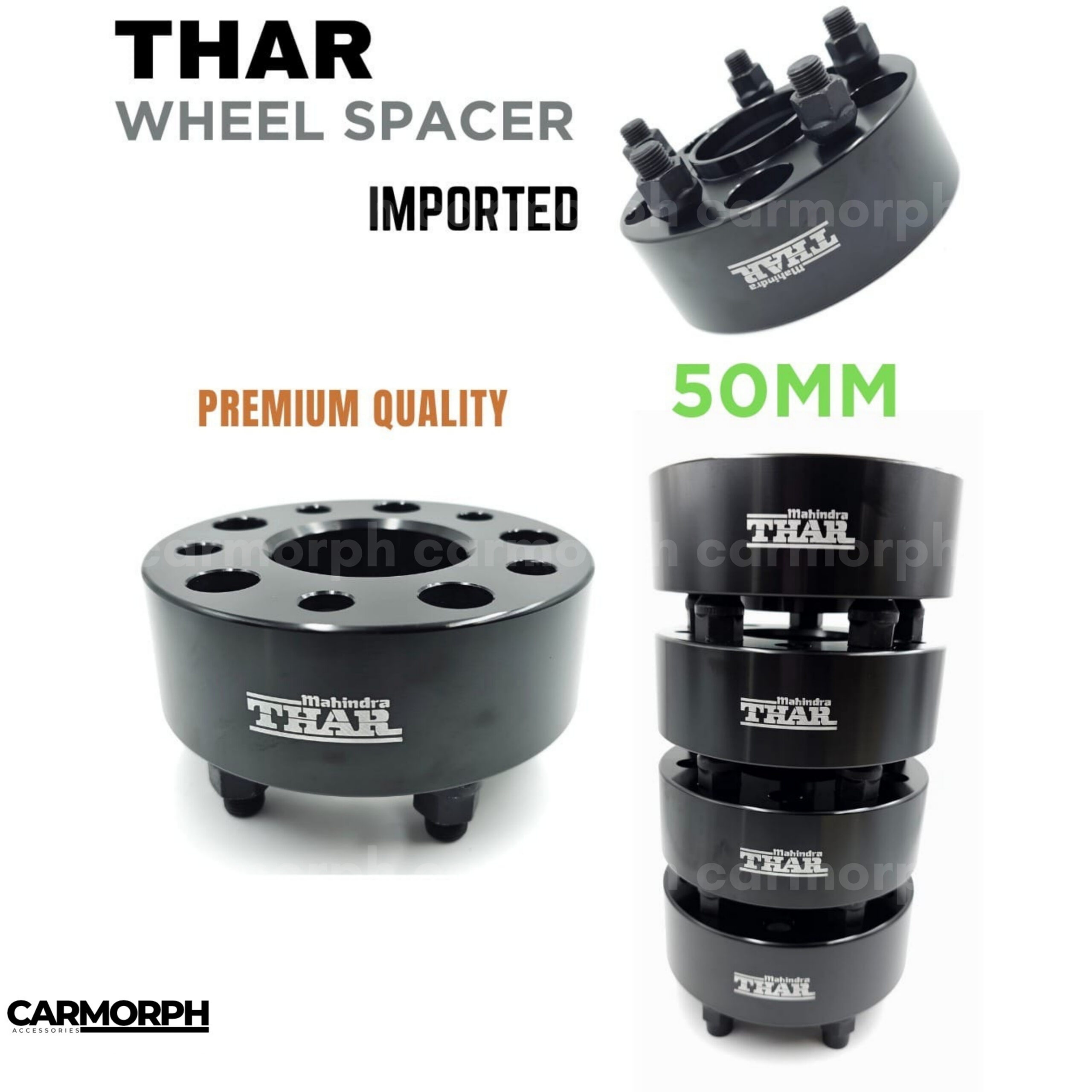 Thar 50MM Wheel Spacer is a high-performance accessory designed to widen the track for enhanced stability, aggressive look, and better handling. Made from CNC-machined aluminum alloy with a corrosion-resistant finish, it features Air Active Cooling vents for optimized heat dissipation during intense drives. The spacer increases tire clearance, allowing wider or larger tires for improved traction, especially in off-road conditions. It is lightweight, durable, and offers easy bolt-on installation with pre-installed hardened bolts.